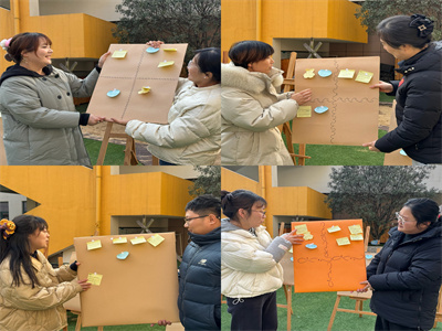 活动现场,教师现场抓阄分为两人一组前往户外美劳区,开启了寻找幼儿户外游戏视频二维码的趣味任务。找到二维码后,老师们扫码观看视频,聚焦视频中幼儿的游戏状态,合作撰写“下一步如何支持幼儿游戏”的便利贴。大家围绕材料投放、玩法引导、互动介入等方向各抒己见,写下“给沙水区增添沙漏和小铲子,支持幼儿自主探索装沙玩法”、“引导幼儿合作游戏,培养团队协作能力”等具体策略。完成便利贴撰写后,老师们围坐在一起展开热烈讨论,分享各自的策略思路,分析不同策略的适宜性与可操作性。